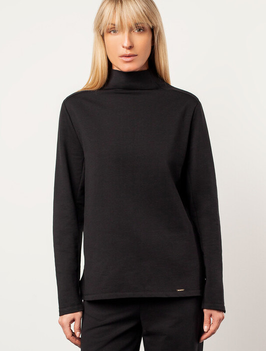 Джемпер выполнен из премиального футера двухнитки. Лаконичная модель с высоким цельнокроеным воротом дополнена разрезами на манжетах и по бокам. Наличие эластана в составе изделия гарантирует идеальную посадку и комфорт. Сочетайте в костюме с брюками D44.122, D44.123 и D44.128