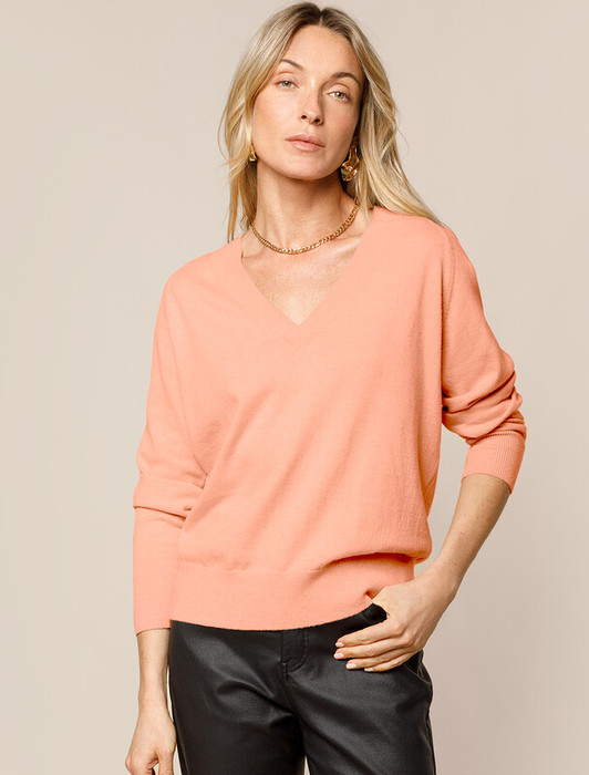 Джемпер тонкой вязки выполнен из хлопка с добавлением кашемира. Модель с V-вырезом свободного силуэта. Мягкая и очень приятная пряжа в рубчик совершенно не колется, сохраняет тепло при этом не перегревая, гарантируя безупречный комфорт.