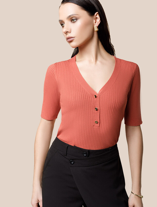 Джемпер тонкой вязки из вискозы с нейлоном. Модель с V- вырезом прилегающего силуэта дополнена золотистыми пуговицами. Мягкая очень приятная к коже пряжа хорошо держит форму и гарантирует комфорт во время носки в течение всего дня. Изделие дополнено фирменным металлическим логотипом бренда.
