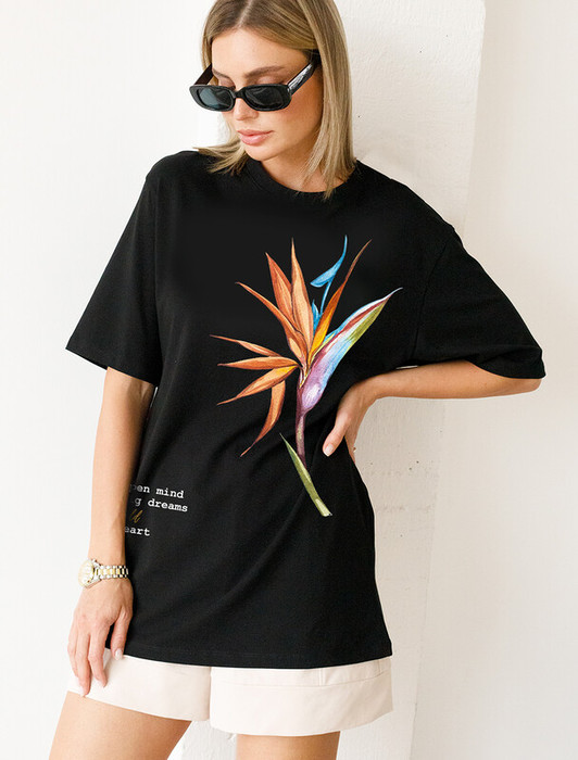 Совместные покупки Нижневартовск Женская одежда Футболки — Vilatte Футболка из премиального хлопка с авторским принтом фольгой D49.978 чер