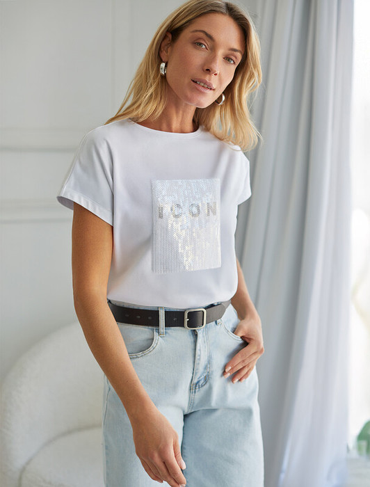 Футболка с цельнокроеным рукавом выполнена из премиального хлопка. Модель украшена принтом расшитым сияющими пайетками. На спинке изделия декоративный разрез без пуговицы. Наличие эластана в составе изделия гарантирует комфорт и формоустойчивость. Внизу металлический логотип бренда. Хорошо впишется как в праздничный образ, так и в повседневный аутфит.