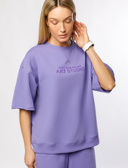 Футболка свободного кроя со спущенным плечом выполнена из футера двухнитки с эластаном. Лаконичный принт нанесен фактурной краской. Эластичный материал гарантирует комфорт и формоустойчивость. Сочетается в костюме с брюками D44.138, D44.139 и шортами D48.008. Изделие дополнено металлическим логотипом бренда.