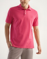 Темно-синее прямое поло выполнено из премиального хлопка пике с характерной фактурой, которая обеспечивает эффективную циркуляцию воздуха. Деликатный акцент в модели выполнен в виде контрастного отложного воротника. Наличие эластана в составе изделия способствует эластичности и меньшей сминаемости. Внизу металлический логотип бренда.