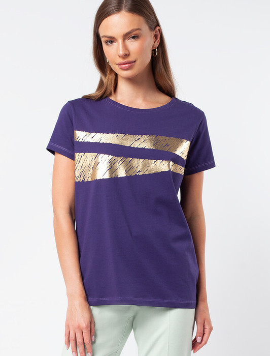 Футболка из премиального хлопка. Авторский принт выполнен золотой фольгой. Изделие украшено металлическим логотипом бренда. Самое высокое качество хлопковых волокон с добавлением эластана. Идеально держит форму и сохраняет внешний вид в течение договременного использования.