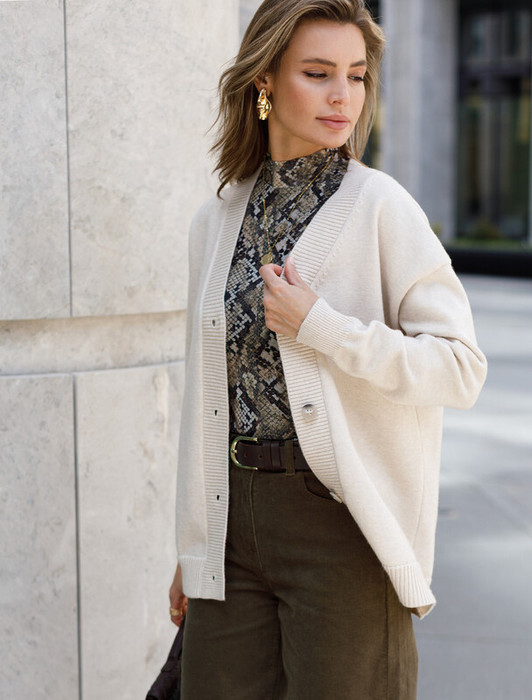 Удлиненный кардиган выполнен из мягкой меланжевой пряжи с добавлением кашемира. Классическая модель с глубоким вырезом прямого силуэта идеально сочетается как с брюками, юбками, джинсами, так и с платьями. Застежка на пуговицы. Изделие очень приятное к телу, совершенно не колется и отлично сохраняет тепло. Сочетается в костюме с брюками D38.013, D38.012 и юбкой D36.016