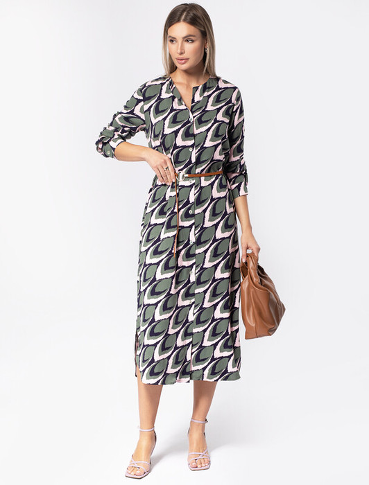 Платье выполнено из премиальной вискозы-твила. Модель с растительным принтом дополнена пуговицами из натурального перламутра. В комплект идет ремешок из эко-кожи. Шелковистая ткань на основе 100% вискозы приятно холодит кожу в жаркое время года. При этом платье с длинным рукавом подойдет на все сезоны. Сдержанная цветовая гамма впишется в как в базовый, так и в яркий трендовый гардероб.