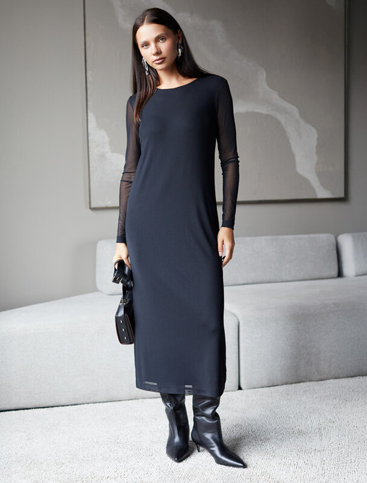 Элегантное платье прямого кроя черного цвета выполнено из воздушной сетчатой ткани с прозрачными рукавами, придающими образу лёгкую игривость. Мягкая вискозная подкладка обеспечивает комфорт, сохраняя при этом эффект полупрозрачности. Универсальный черный цвет делает платье идеальным для базового гардероба.
