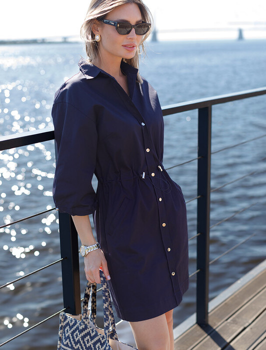 Платье в стиле сафари выполнено из тонкого хлопкового твила. Пышные рукава и пояс на кулисе с регуляторами. Модель дополнена боковыми карманами и застежкой на золотистые пуговицы. Благодаря наличию эластана в составе, изделие сохранит свой безупречный внешний вид в течении долгого времени. Обладает высокой воздухопроницаемостью, благодаря в платье будет комфортно даже в жаркое время года.