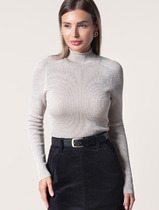 Свитер фактурной вязки выполнен из эластичного трикотажа на основе вискозы. Добавление в состав пряжи мягкого люрекса создает праздничное сияние. Изюминка модели – контрастное сочетание на манжетах и по нижнему краю. Идеально сидит по фигуре, подчеркивая силуэт. Изделие не колется и комфортно в носке даже на голое тело. Дополнительным украшением служит металлический логотип бренда.