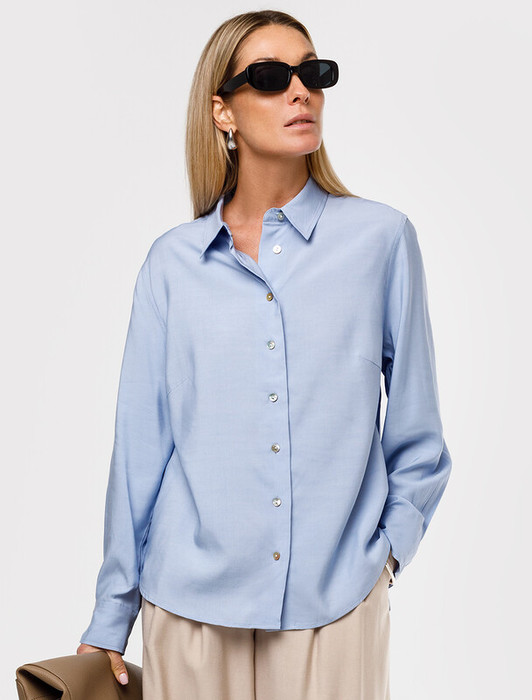 Свободная блузка из премиальной вискозы и лиоцелла. Приятная на ощупь ткань пропускает воздух и поддерживает оптимальный микроклимат. Модель оснащена отложным воротником и застежкой на пуговицы из натурального перламутра. На спинке изделия фирменный логотип бренда. Блуза будет одинаково хорошо смотреться и в повседневном наряде, и в образе для офиса.