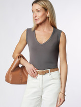Топ выполнен из премиального хлопка с эластаном. V- вырез подчеркивает линию декольте и визуально вытягивает шею. Лаконичная базовая модель впишется в любой гардероб и дополнит многослойные образы. Материал изделия хорошо тянется и гарантирует идеальную посадку по фигуре. Из украшений только металлическим логотипом бренда.