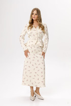 Юбка прямого силуэта выполнена узорной вязкой из мягкой хлопковой пряжи. Тонкий ажурный трикотаж идеально подходит для теплой весны и лета, в нем будет комфортно и не жарко. Модель дополнена разрезом на ноге и подкладкой из трикотажного полиэстера, такой материал гарантирует формоустойчивость юбки и скрывает излишнюю прозрачность. Сочетается в костюме с джемпером D33.007 и D39.629