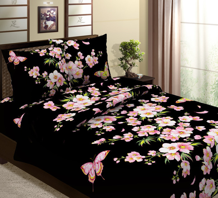 ВЛАДЛЕН Постельное белье из бязи (150см) Сакура (чёрный)