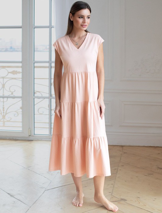 Состав: 100%ХлопокСтильное платье миди с V вырезом нежного пудрового цвета выполнено из 100% хлопка плотностью 140 Г/м2. Главная особенность этого изделия — тонкое кулирное полотно, которое легче и воздушнее стандартного трикотажа. Благодаря своей деликатной текстуре модель идеально подходит для домашних образов и пижамных комплектов. Ткань отлично «дышит», обеспечивая максимальный уют во время сна и отдыха. Платье ярусного кроя красиво подчеркивают фигуру, скрывая возможные недостатки и акцентируя достоинства. Свободное платье отлично подойдет на большие размеры. Длина платья миди обеспечивает гармоничное сочетание комфорта и элегантности, подходя для разных поводов. V-образное декольте придает образу нежность и женственность, а ярусная конструкция добавляет образу эффект воздушности и динамичность. Материал натуральный и приятный к телу, создает ощущение легкости и свежести. Такое повседневное платье подчеркнет индивидуальность и стиль.