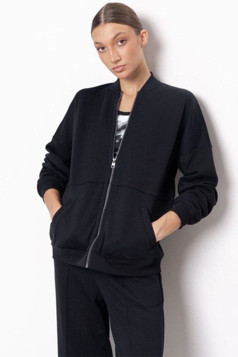 Куртка –бомбер свободного прилегания на металлической молнии. Линия плеча спущена.  Воротник, пояс и манжеты рукавов выполнены из рибаны. Предусмотрены функциональные карманы.