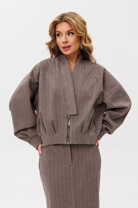 Жакет-бомбер "оверсайз" со спущенным плечом, воздушным рукавом, по низу рукава бантовые складки. По переду застежка на молнию, воротник "шаль". Перед жакета на кокетке, по низу заложены складки. Спинка на кокетке, по низу резинка.