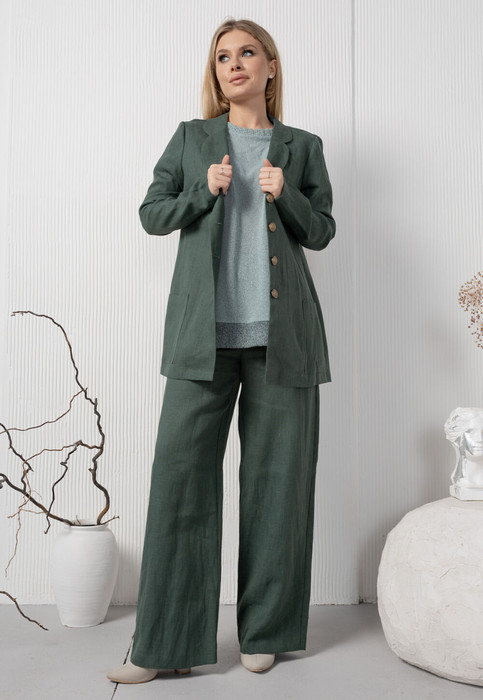 Льняной  жакет  современного прямого кроя с накладными карманами. Изделие без подкладки.