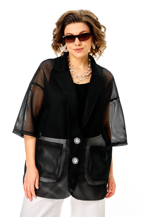 Жакет женский из оригинального трикотажного полотна, напоминающего объемные соты, станет отличным дополнением к вашему гардеробу. Модель прямого силуэта со спущенным рукавом, рукав 3/4 длины, застежка на пеллю и пуговицу, воротник пиждачного типа. По полочке идут накладные карманы, низ фигурный. Все шва и срезы не обработаны. Длина рукава: (50-66)-28см. Длина по спинке : (50-54)-76см., (56-60)-78см, (62-66)-80 см