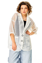 Жакет женский из оригинального трикотажного полотна, напоминающего объемные соты, станет отличным дополнением к вашему гардеробу. Модель прямого силуэта со спущенным рукавом, рукав 3/4 длины, застежка на пеллю и пуговицу, воротник пиждачного типа. По полочке идут накладные карманы, низ фигурный. Все шва и срезы не обработаны. Длина рукава: (50-66)-28см. Длина по спинке : (50-54)-76см., (56-60)-78см, (62-66)-80 см