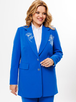Полочка жакета с двубортной застежкой на петли и пуговицы, вертикальными рельефами и прорезным карманом с клапаном. Горловина V-образной формы, с отложными лацканами и воротником пиджачного типа. Спинка со средним швом и вертикальными рельефами. Рукав длинный, двухшовный, втачной.