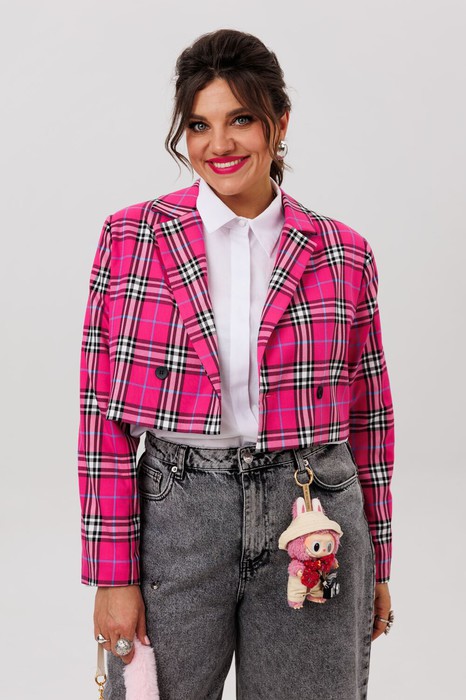 Этот укороченный двубортный жакет, словно созданный для тех, кто ценит баланс между классикой и современностью, идеально подчеркивает силуэт, добавляя образу лёгкую дерзость и безупречный стиль. Выполненный из благородной костюмной ткани в изысканную клетку, он сочетает в себе строгость кроя и игривость актуальных оттенков.