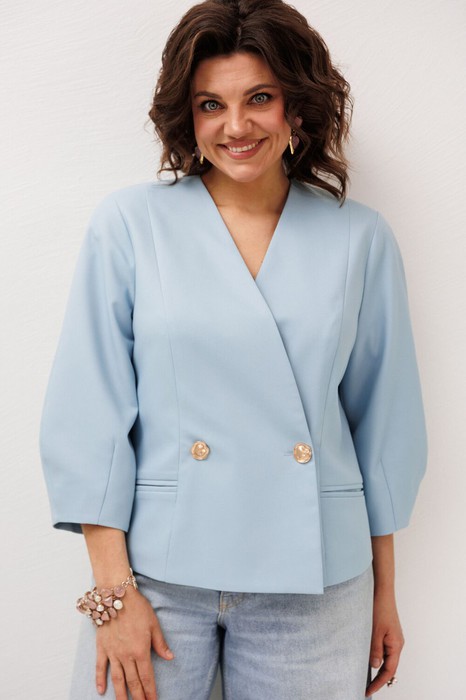 Жакет в нежном голубом оттенке «голубка» словно наполняет образ лёгкостью и спокойной уверенностью. Полуприлегающий силуэт мягко подчеркивает линии фигуры, создавая аккуратный и женственный образ без излишней строгости, а V-образный вырез добавляет утончённости и визуальной лёгкости. Двубортная застёжка украшена красивенными золотыми пуговицами, которые деликатно притягивают взгляд и придают жакету благородное сияние, делая образ более выразительным и элегантным. Рельефы по спинке и полочке формируют изящную посадку, а прорезные карманы в рамку становятся лаконичным акцентом, подчеркивающим продуманность каждой детали.