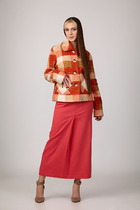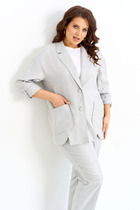 Жакет-бомбер женский прямого силуэта, с притачной манжетой понизу, без подкладки. Горловина округлая с втачной стойкой. По переду центральная застежка на кнопки и наклонные прорезные карманы с листочкой. Рукава длинные втачные, со спущенной линией плеча, понизу - на манжете. Воротник-стойка, манжеты по низу рукава и по низу жакета из трикотажного довяза.