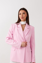 Жакет полуприлегающего силуэта выполнен из полотна насыщенного голубого цвета. Характеристики: полуприлегающий силуэт, подкладка, подплечники, двубортная застежка, миниатюрные не функциональные пуговички по переду изделия, воротник с остроугольным лацканом, по переду карманы с клапаном, рукав втачной, по низу рукава вертикальный разрез, разрез на пуговичках. Длина жакета 69 см, длина рукава 63.