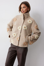 Жакет прямого кроя выполнен из замшевой ткани. Характеристики: подкладка, остроугольный воротник из отделочной ткани, застежка центральная на петли пуговицы, по передней части изделия накладные карманы, рукав спущенный, втачной, низ рукава - манжета на пуговице. Длина по спинке 72 см, длина рукава 53 см
