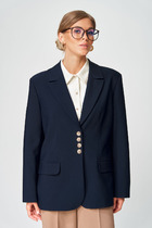 Жакет прилегающего силуэта выполнен из костюмный ткани черного цвета. Характеристики: прилегающий силуэт, однобортный, подплечники, вортник стойка переходяший в V-образный вырез, подкладка, застежка центральная на петлю пуговичку, рукав втачной, по низу рукава пуговички, по переду декоративные острые клапаны, отрезной бочок. Длина по спинке от края горловины 71 см, длина рукава от края стойки 84 см.