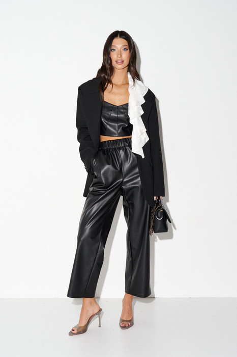 Жакет прямого кроя. Выполнен из костюмной ткани чёрного цвета. Декорирован двухслойным воланом из шитья белого цвета (волан отстёгивающийся, застёжка - пуговицы). Жакет с подкладом. Воротник отложной с лацканами. Рукав втачной. Линия плеча с подплечниками. Карманы с клапаном (функциональные). Застежка центральная на петлю-пуговицу. В среднем шве спинки шлица 24 см. Длина спинки 77 см, длина рукава 64 см