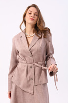 Жакет комбинированный выполнен из костюмной ткани черного цвета. Характеристика: левая часть жакета укороченная, с выточками по переду и со спинки изделия, длина по центральному шву от края горловины 36см, правая часть жакета удлиненная, полуприталенный силуэт по переду и со спинки есть выточки, длина по центральному шву от края горловины 72см, отложной воротник, подклад, подплечники, рукав вточной, застежка центральная петля-пуковица. Длина рукава от края горловины 78см.
