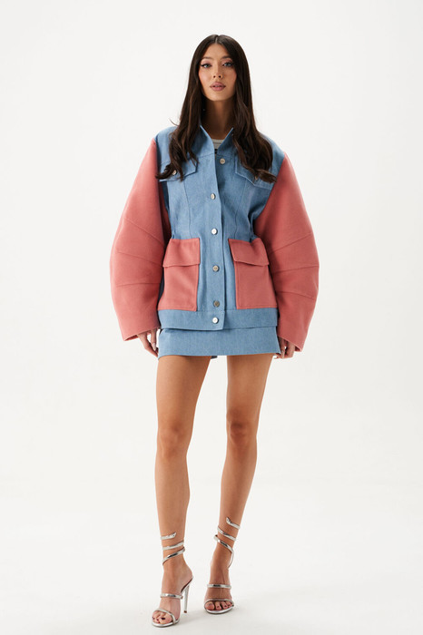 Жакет прямого свободного кроя, выполнен из джинсовой ткани светлого денима с вточными рукавами из пальтовой ткани розового цвета. Характеристики: прямой крой, отложной воротник, по переду крупные накладные карманы с клапанами, застёжка центральная на пуговицы, по боковым линиям талии кулиска с фиксатором затягивающаяся изнутри, рукав свободный, заужен к низу. Длина изделия 70 см, длина рукава 65 см.