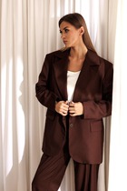 Жакет прямого свободного кроя. Выполнен из костюмной ткани в цвете хаки с полоской красного цвета. С подкладкой. Воротник отложной, с лацканами. Рукав втачной, немного спущен. Есть подплечники. По переду карманы с клапаном (функциональные). В среднем шве заднего полотна высокая шлица (48 см). Застёжка центральная пуговицы. Длина спинки 76 см. Длина рукава от линии втачиваня 61 см. В комплекте пояс из основной ткани