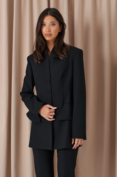 Жакет прилегающего силуэта выполнен из костюмный ткани черного цвета. Характеристики: прилегающий силуэт, однобортный, подплечники, вортник стойка переходяший в V-образный вырез, брендированная подкладка, застежка центральная на 3 пуговицы, рукав втачной, по низу рукава 3 пуговицы, декоративный волан, вставленный по талии. Длина по спинке от края горловины 75 см, длина рукава 64 см.