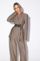 Жакет прилегающего силуэта. Выполнен из костюмный ткани белого цвета. С подкладкой. Воротник-стойка. Вырез горловины V-образный. Рукав втачной, объёмный, заужен к низу. По переду карманы с клапаном. Застёжка центральная - пуговицы. Низ жакета фигурный. Длина спинки 69 см. Длина рукава от линии втачивания 63 см