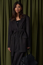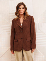 Жакет прямого свободного кроя, выполнен из костюмной ткани черного цвета. Характеристика: V-образный вырез горловины, отложной воротник, застежка центральная на две петли пуговицы, функциональные карманы с клапанами, брендированная подкладка, широкое плечо, подплечники, рукав втачной, на манжете функциональные пуговицы, в среднем шве заднего полотна изделия шлица 51 см. Длина изделия по центральному щву по спине 118 см, длина рукава от края горловины 84 см.