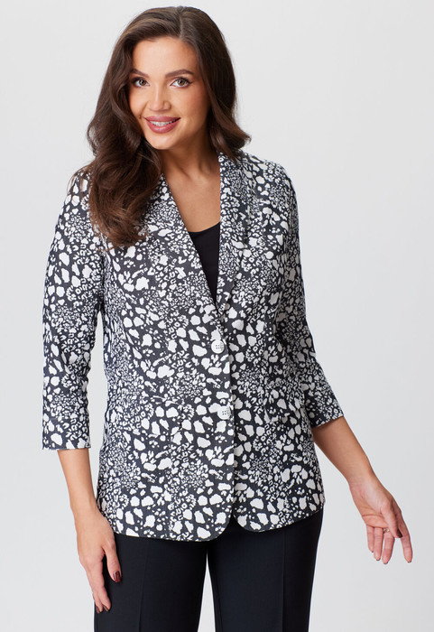 Жакет женский удлиненный, полуприлегающего силуэта с центральной бортовой застежкой на пуговицы до линии перегиба лацкана. Спереди рельефные швы от плечевого шва,отрезной бочок и карман с клапаном. Спинка с рельефами от плечевого шва. Рукав втачной, двухшовный, 3/4, с небольшим разрезом в локтевом шве. Воротник пиджачного типа. Жакет выполнен из джинсовой х/б ткани. Перед жакета на подкладке. Длина рукава 50, длина по спинке 68 см.