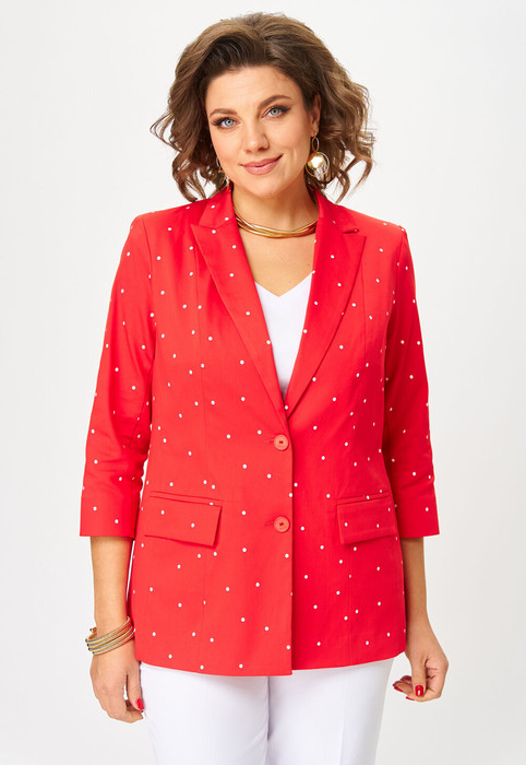 Жакет женский удлиненный, полуприлегающего силуэта с центральной бортовой застежкой на пуговицы до линии перегиба лацкана. Спереди рельефные швы от плечевого шва, отрезной бочок и карман с клапаном. Спинка с рельефами от плечевого шва. Рукав втачной, двухшовный, 3/4, с небольшим разрезом в локтевом шве. Воротник пиджачного типа. Перед жакета на подкладке. Длина рукава 50, длина по спинке 68 см.