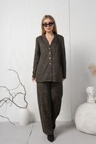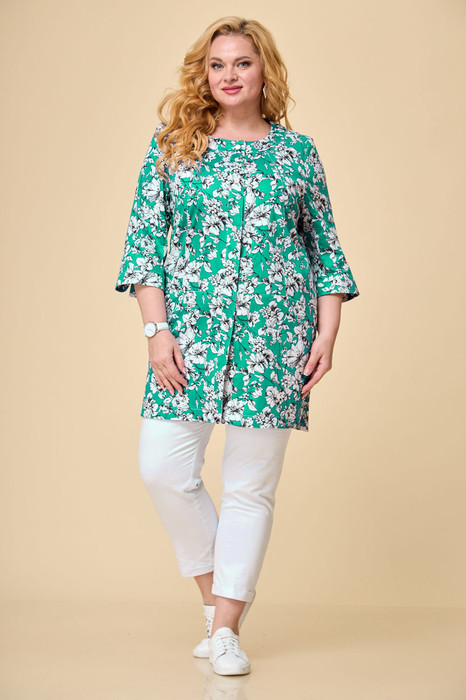 Женский жакет-блуза, прямого силуэта, из хлопковой ткани. Горловина округлой формы, застежка центральная на притачную планку, застегивается на металличесские кнопки. В отрезной части переда обработаны карманы. Спинка цельная. Низ фигурный. В боковых швах разрезы. Рукав втачной, двухшовный, с притачной манжетой, 3/4. Изделие без подкладки. По швам проложены отделочные строчки. Длина рукава 46 см, длина по спинке 86 см.