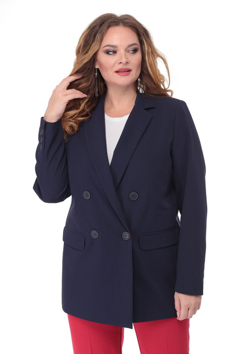 Двубортный жакет, свободного кроя, на подкладке. По переду имеется отрезной бочок и вертикальные вытачки. С прорезными карманами с клапаном и двумя обтачками. Спинка цельная. Воротник пиджачного типа. Рукав двухшовный, по низу рукава обработана шлица на петли-пуговицы. Длина рукава 63 см, длина по спинке 74 см.