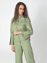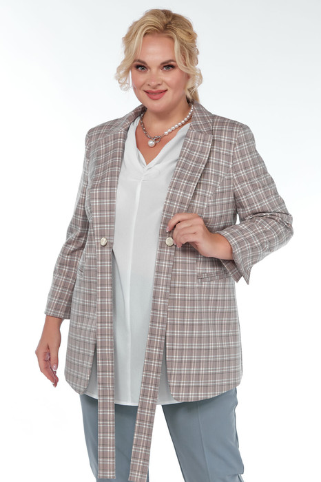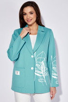 Жакет женский  полуприлегающего силуэта, выполнен из костюмной ткани, на подкладке. Воротник сложного кроя с завязками и пуговицами, рукав двухшовный с разрезом, на полочке обработаны карманы.