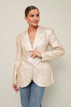 Элегантный женский жакет, выполнен из жаккардовой ткани, в стиле «Шанель». Жакет свободного силуэта, с накладными карманами, по краю карманов тесьма с вытрепанным краем. Застежка центральная на петли пуговицы, горловина круглая. Рукава втачные, длинные. Жакет на подкладке.