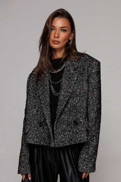 Жакет укороченный прямого силуэта, двубортный с втачным двухшовным рукавом. Полочка с застежкой на петлю-пуговицу и имитацией кармана с клапаном и отрезным бочком. Спинка с отрезным бочком и центральным швом. Воротник пиджачного типа с отрезной стойкой. Жакет на подкладке.
