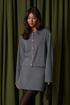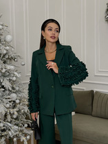 Жакет, укороченный прямого силуэта, двубортное с втачным двухшовным рукавом. Полочка с застежкой на петлю-пуговицу и имитацией кармана с клапаном. Спинка с центральным швом. Жакет с отрезным бочком, переходящим на полочку и на спинку. Воротник пиджачного типа с отрезной стойкой. Жакет на подкладке.