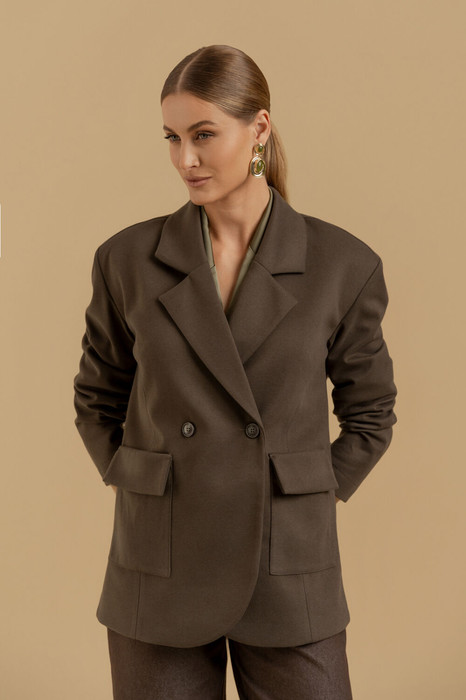Жакет прямого покроя из мягкого трикотажного полотна.  Вырез горловины оформлен воротником пиджачного типа с двубортной  застежкой на петли с пуговицами. Рукава - втачные с расширенной линией плеча. Усилены плечевыми накладками. На передних половинках - настрочные карманы с цельнокроеными отворотами, имитирующими клапаны. Перед изделия посажен на подкладку.