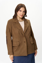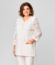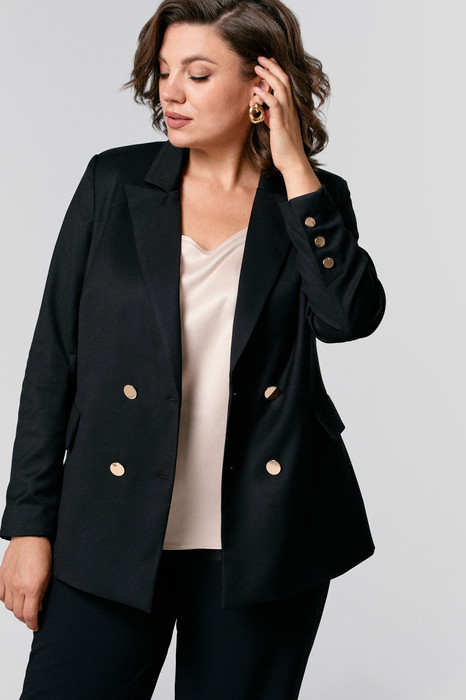 Жакет полуприлегающего силуэта, на подкладке; воротник пиджачного типа; рукава втачные; по переду функциональные прорезные карманы; застежка двубортная на петли и пуговицы.