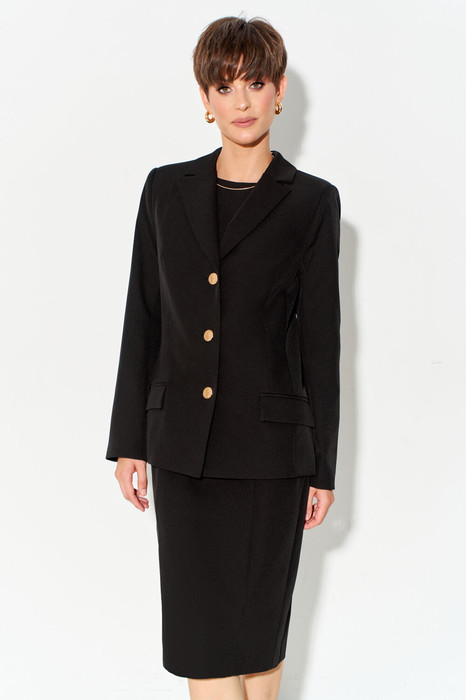 Классичесий женский жакет на подкладке полуприлегающего силуэта выполнен из костюмной ткани с содержанием вискозы. По переду функциональные прорезные карманы; воротник пиджачного типа; застежка на петли и пуговицы; рукава втачные. Жакет  полностью соответствует заявленному размеру. Пожалуйста, пользуйтесь таблицей обмеров готового изделия.