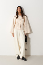 Жакет в стиле smart casual. Жакет прямого силуэта с пиджачным воротником, имеет удобные накладные карманы и застежку на 2 пуговицы. На левом лацкане вышивка-логотип в цвет ткани. Низ и борта имеют открытые края (эффект необработанного шва), укреплены дополнительной строчкой. Жакет без подкладки.