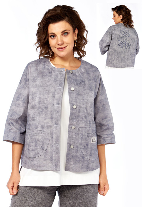 Жакет прямого силуэта, с центральной бортовой застежкой на петли и джинсовые пуговицы. Горловина округлой формы с отрезной обтачкой. По переду обработаны рельефы и накладные детали фигурной формы, в которых выполнены карманы. На спинке обработаны рельефы и кокетка. Рукава спущенные, с широкой подгибкой низа. Изделие дополнено по спинке дизайнерской вышивкой.